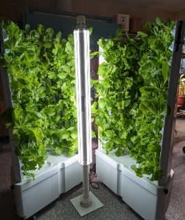 The Flex Farm system uses 98% less land and 98% less water than traditional agriculture and zero food miles. It is 40% more energy efficient than other hydroponic systems in part due to its cylindrical design which wastes less light from the LED light source. Pec high school botany students assembled the unit, middle school science students planted the lettuce seeds, and the botany students checked the pH and nutrient levels twice a week for 7 weeks.
